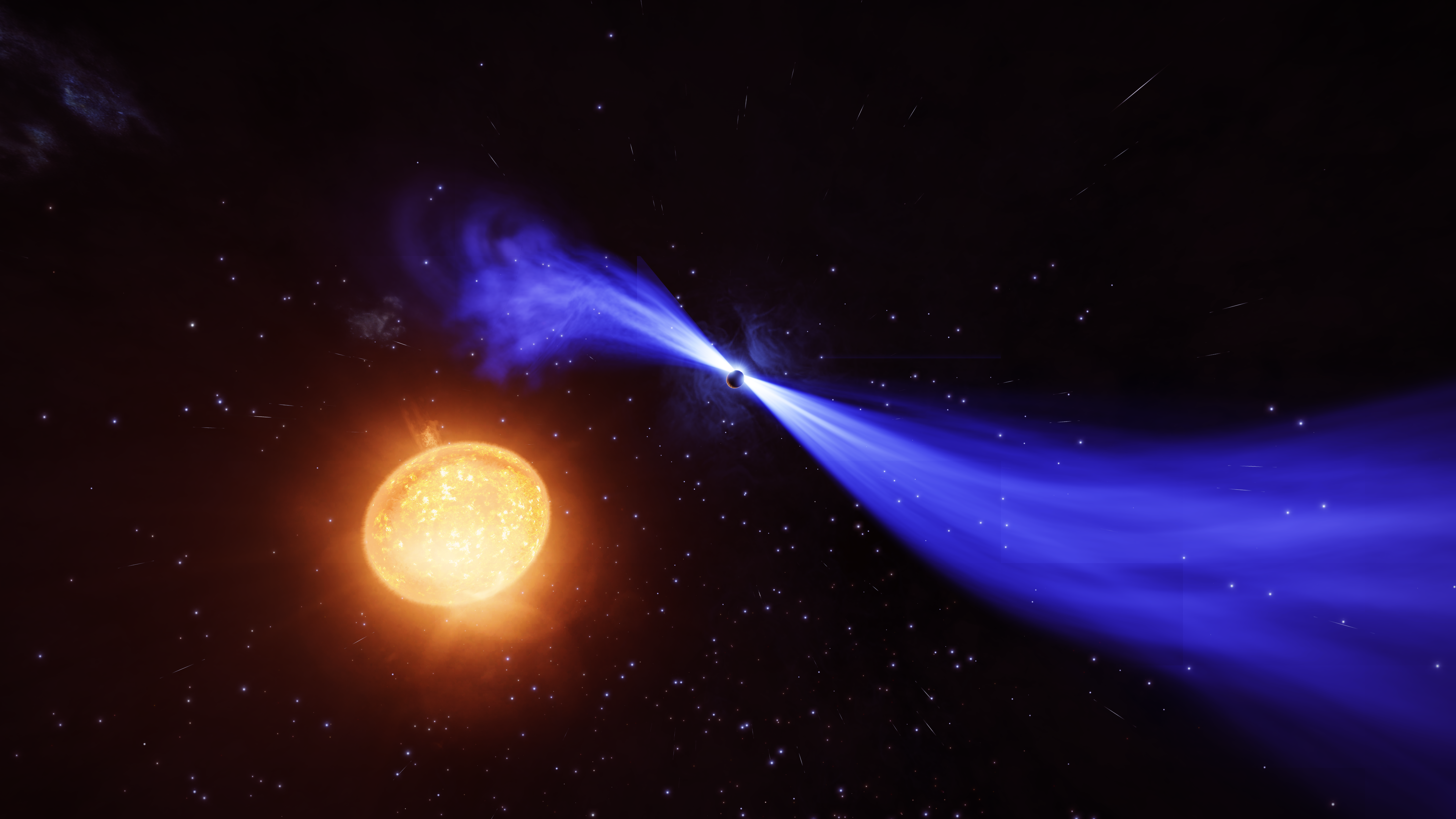 This system has a class V gas giant so close in to the white dwarf primary that it orbits the host every 15 minutes, passing through the jets as it does so. This is definately a temporary arrangement – the gas giant is slowly spiralling down into the star. If it is not torn apart by tidal forces or cremated by the jets it will end its life soon by smashing down into the white dwarf.
