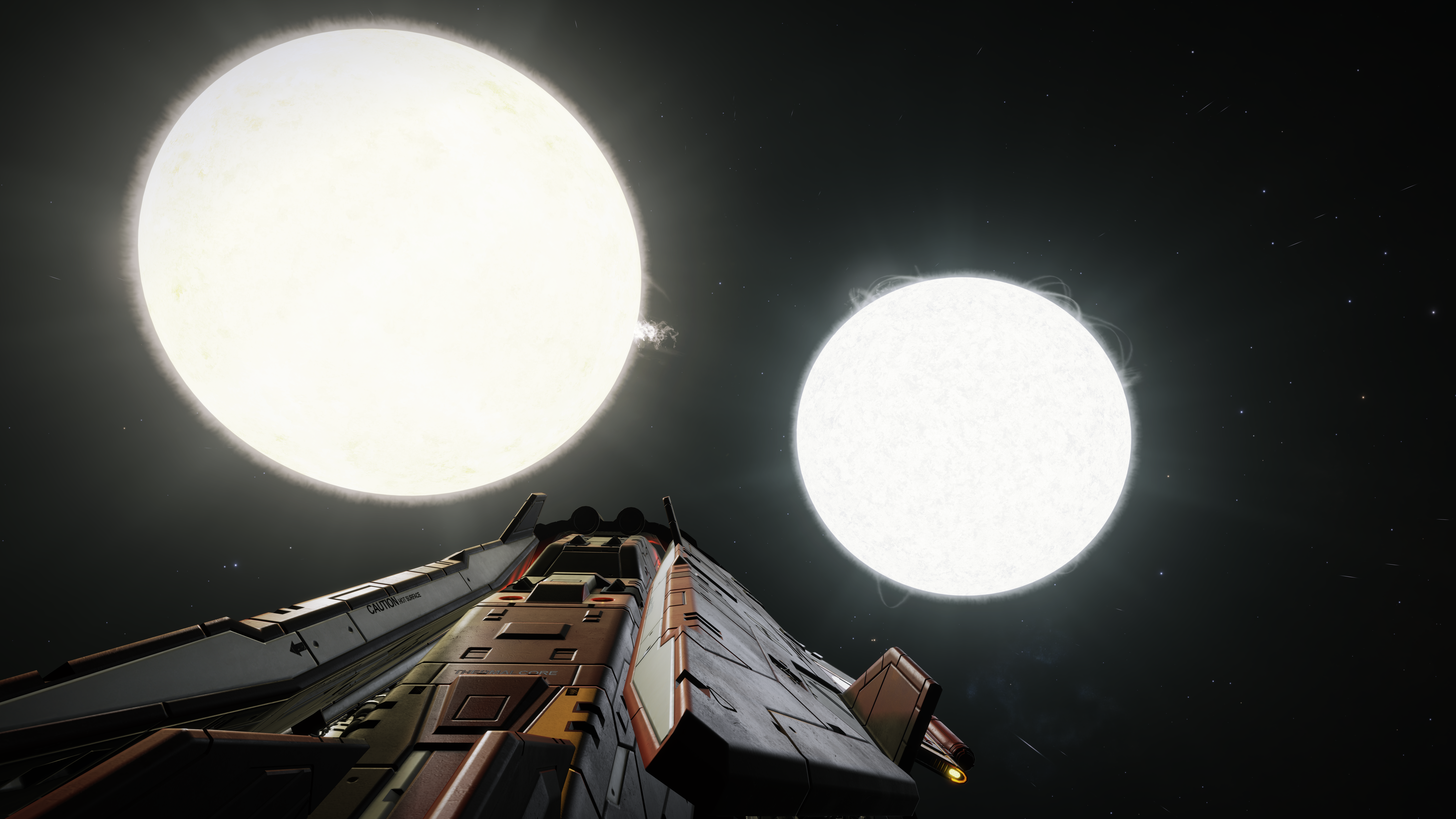 We passed an interesting binary system on the way in at Plaa Eurk VT-R d4-17. The primary was a class F star, the secondary an A class. I ended up barrelling through the gap between them scooping as I went. Luckily the ship coped with the elevated thermal conditions without breaking a sweat (literally!).