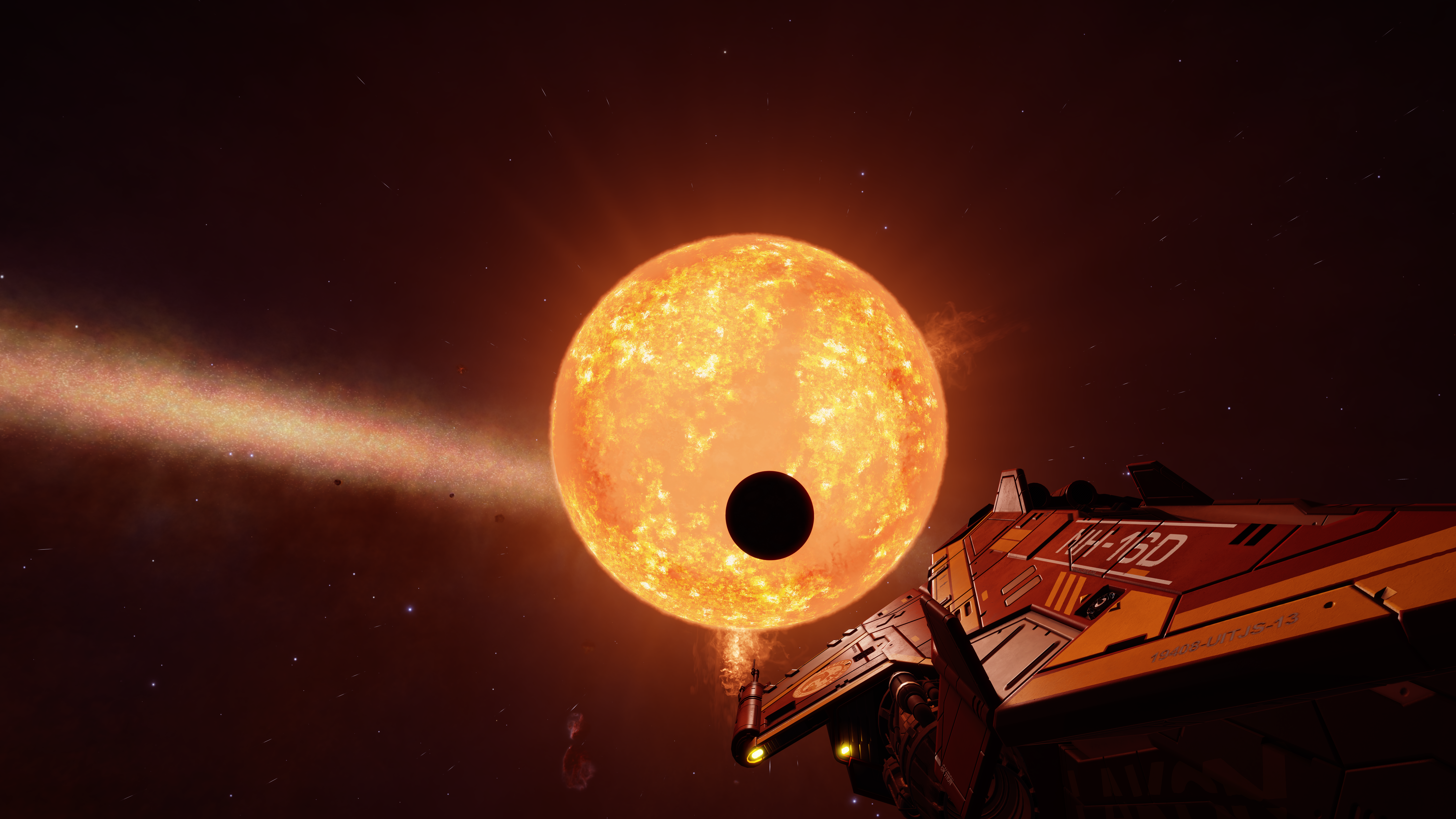 There is a mystery here in VV Cephei. Back in the 20th century astronomers on Earth saw this system as a binary – VV Cephei had a companion, a blue-white dwarf star. Nothing unusual about this – until mankind arrived in this system. The first explorers found there was no blue-white companion star, and to this day it remains a mystery as to where it could have gone.